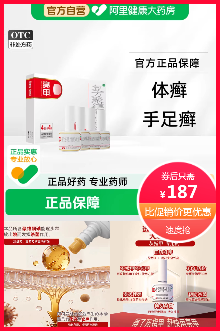 它的成分是复方聚维酮碘,这个成分具有杀真菌和抗菌作用,可以快速渗透到甲板中,有效治疗剂!这款神奇的搽剂,不仅具有强大的杀真菌功效,还能快速缓解灰指甲带来的尴尬和不适。