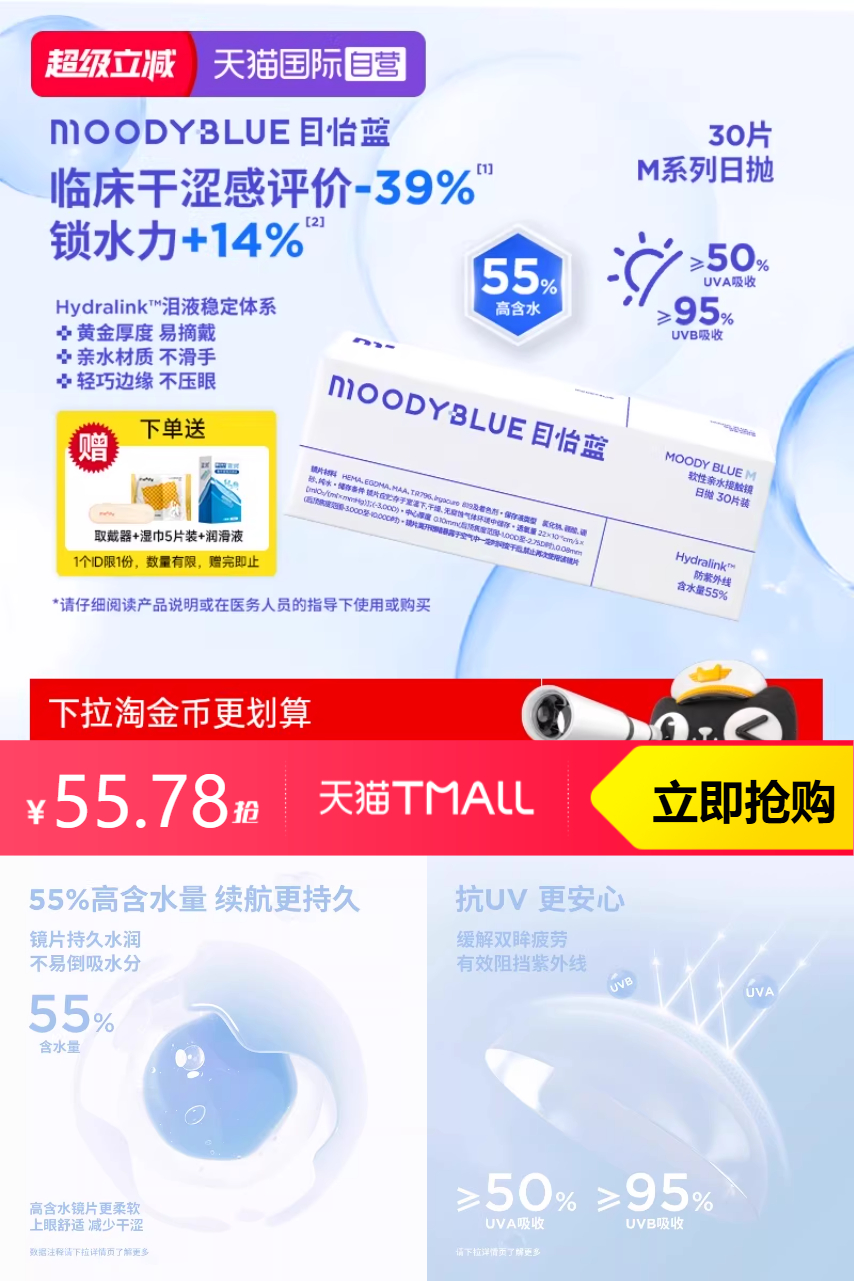【88vip减2.79元+淘金币减3.75元,到手49.24元!下单送取戴器+湿巾+润滑液】moody日抛小蓝片透明隐形眼镜30片,临床干涩感评价-39%,锁水力+14%!采用泪液稳定系统,三效合一,减缓泪液流失,长效水润戴镜!镜片表面锁水涂层,戴镜锁水不易倒吸,泪液更充盈!快来试试吧!