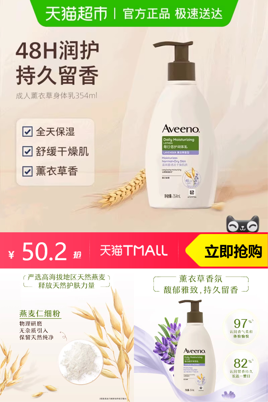 【立减26购物券减5 会员减3.2 淘金币减7.6 品牌金减3 到手50.2】艾惟诺倍护薰衣草燕麦滋润身体乳,一瓶即刻唤醒肌肤的活力,告别干皮、告别裂纹,从此让你的肌肤如丝般滑顺。