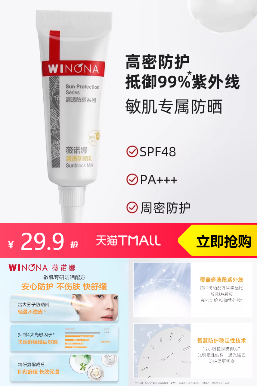 【叠加淘金币0.89元,到手29.01元】薇诺娜防晒乳30g(SPF48),敏感肌专研防晒,外防内养,敏肌安心晒!日晒阳光强势攻击,多光谱防护,抵御99%紫外线!晒后肌肤灼热红敏,精准抑制4大光敏因子!担心加重肌肤负担,敏肌专研,安心更安心!快来试试吧!