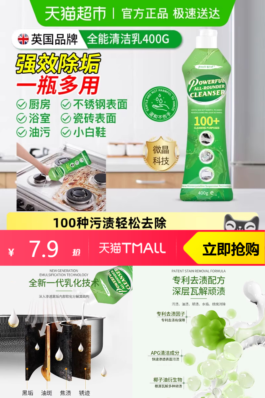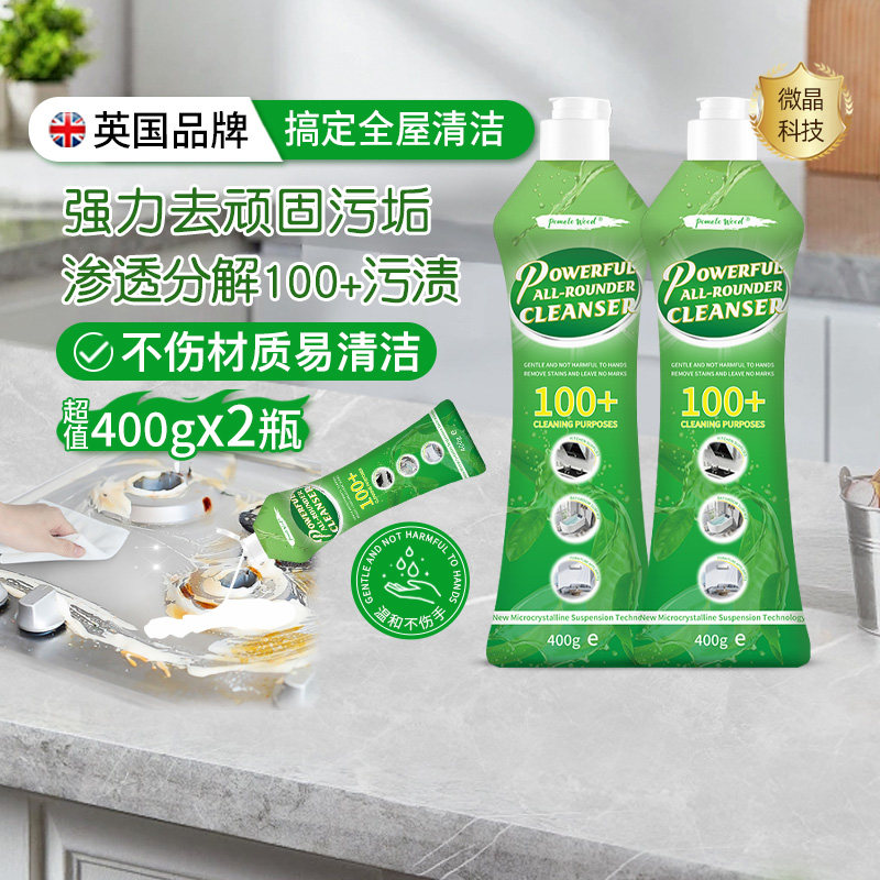 【88vip九五折减0.4,淘金币抵扣1,79,到手5.71】柚慕多功能清洁剂*400g,快速去污免冲洗,强力全能清洁乳!遇水即溶不伤材料,轻轻一擦,污垢全不见!微晶研磨颗粒,深层瓦解顽渍;全新微晶悬浮技术,含50%微晶去污颗粒!中性配方,温和不伤手,不伤材质,轻松去除污渍,洁净不留痕!快来试试吧!