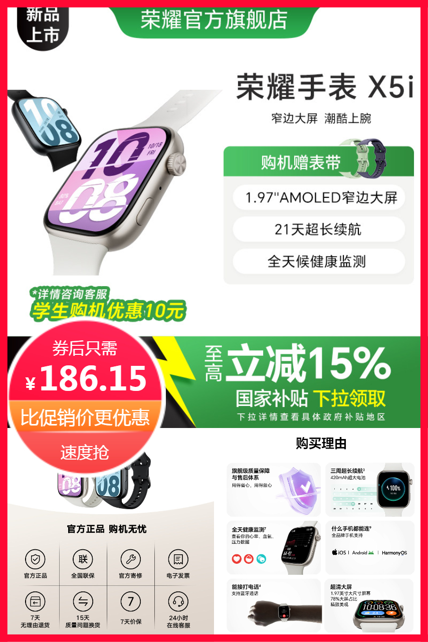 下拉详情页国补15%~领10元优惠券叠加国补到手186.15元,凭学生证找客服可再减10元,荣耀手表 X5i ,智能运动手表 ,具备窄边大屏, 长续航, 全天候健康监测等多功能趁活动安排起来~