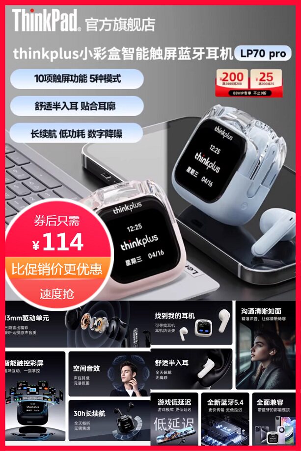 【超.级立减60元】thinkplus小彩盒智能触屏蓝牙耳机,舒适半入耳设计,贴合耳廓,久戴不痛。10项功能一触即达,接听电话、设置闹钟、找到耳机、音乐控制、语言切换、自定义音效、音量调节等丰富功能操控。