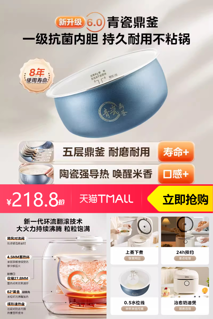 ⭕美的电饭煲家用飞快煮0氟青瓷抗菌不沾内胆