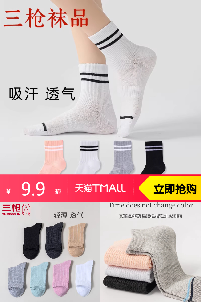 【可叠加淘金币0.35元到手仅需9.55元】任选三枪运动中筒袜5双,轻薄透气。