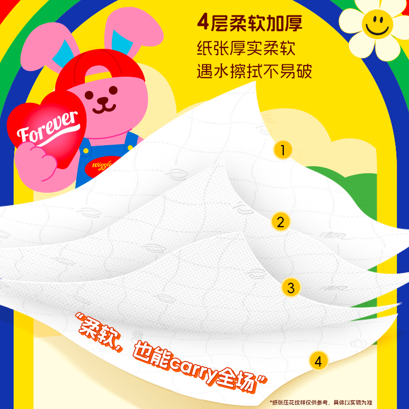 【柔软亲肤】的清洁之选,适合各种场合使用,为您的生活带来便利与舒适。每包内含四层,满足您对卫生纸巾的需求。