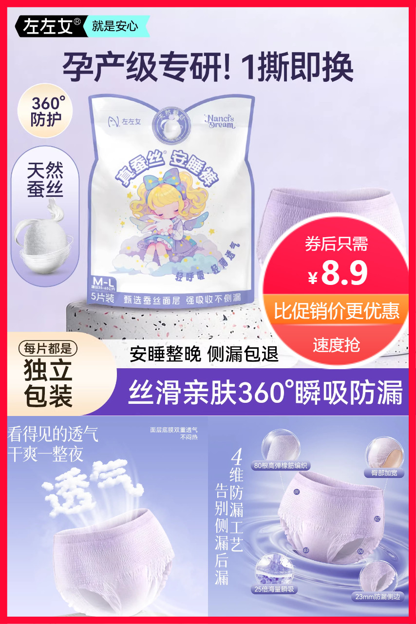 左左女真蚕丝安睡裤,产妇都可用,裸感亲肤,高腰不勒肚,敏感肌也能放心用,360°贴身防漏,肆意翻身也安心!舒适不闷!高弹柔软,不同身型都好穿。超强吸收力,瞬吸不反渗,穿着无负荷,安睡一整晚。