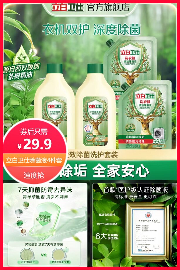 超市立减12元+券35元后约29.9元,拍1到手4件,单件只需7.4元,内含立白卫仕除菌洗衣液260ml*2瓶+洗衣机用除菌液2袋,7天抑菌防霉无异味,洗衣机桶一次用除菌液一袋即可!守护全家衣物健康!