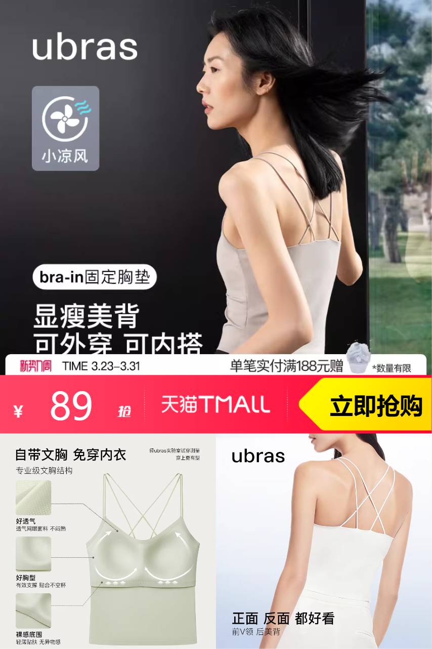 【原价199-立减110-礼金17.8元-淘金币大额抵9.98元-百亿金刚券8.9元-消费券8.9元=到手43.42元】【刘雯同款】ubras带胸垫打底吊带内衣,吸湿速干,汗水热气快速扩散至衣物表面 肌肤持久干爽~