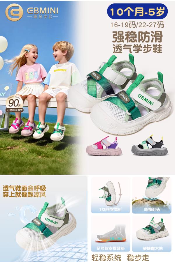 英贝米尼学步鞋2026夏季新款!多巴胺配色+立体包头设计,透气网面+超柔软底,宝宝学步稳又萌~159.9元享高端婴童品牌品质!轻量缓震+防滑耐磨大底,细节考究,妈妈安心之选!,等你带回家!