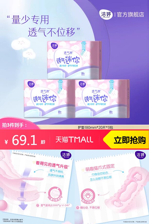 推荐:拍3件!洁婷日用迷你护垫卫生巾180片
