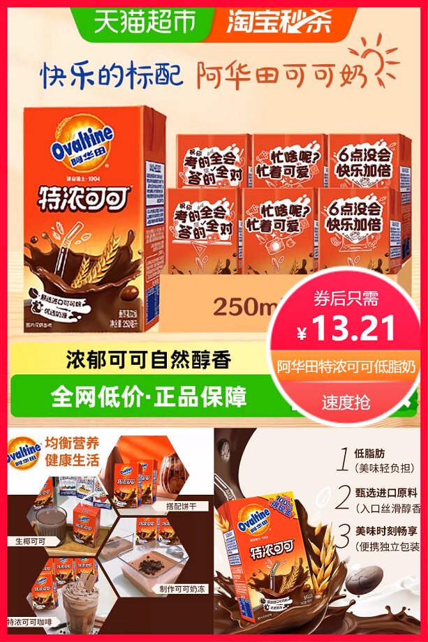 秒杀直降8元+券2元+88VIP省0.75元+新客立减2元+淘金币省1.69元后约10.46元,阿华田特浓可可低脂早餐奶250ml*6盒,学生儿童营养好选择!香浓可可味,口感醇厚,富含营养。淘金币+秒杀优惠,部分用户可享立减10元,健康美味更实惠!