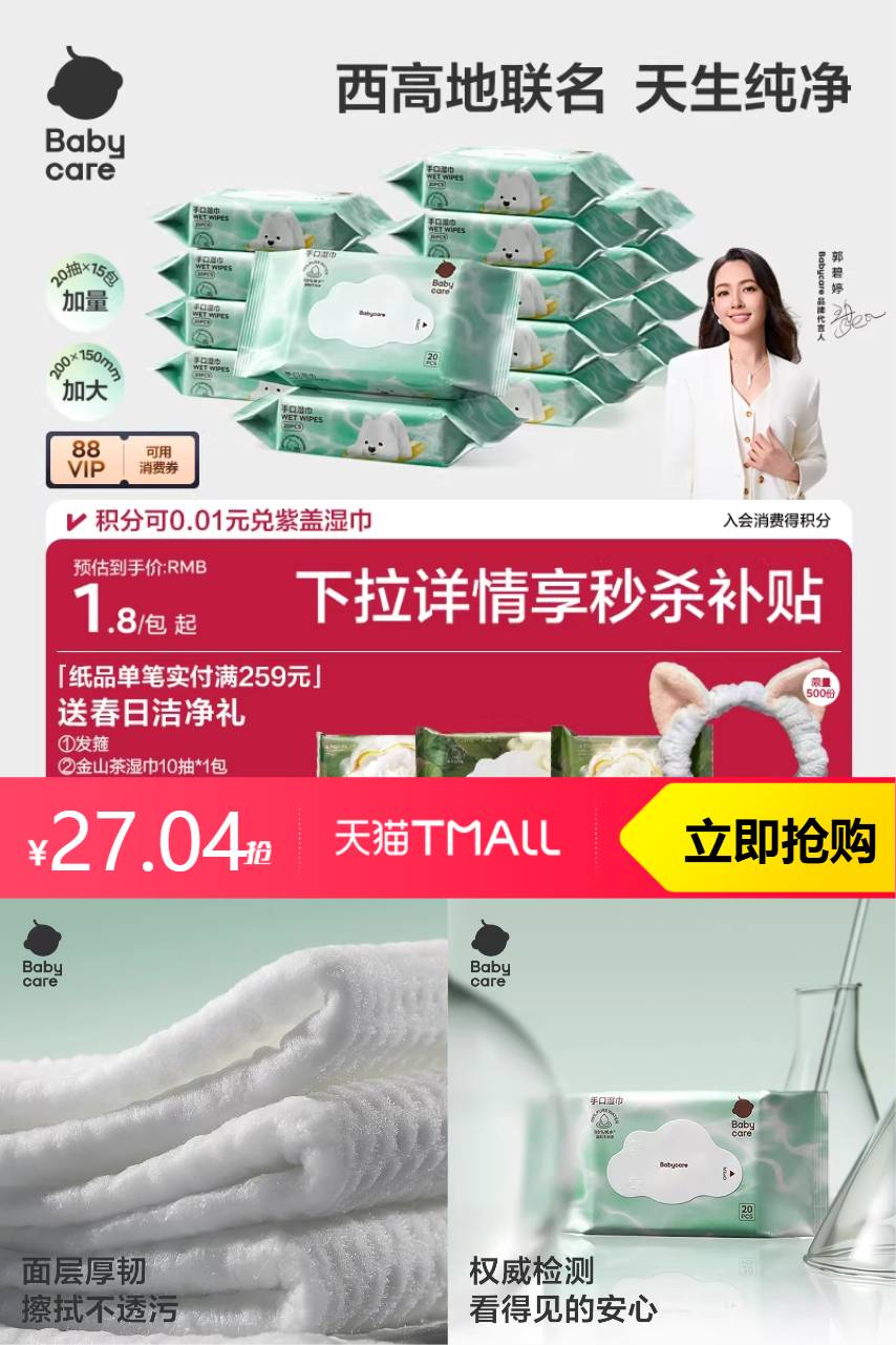 【春游出行便携必备,下拉秒杀跳转到秒杀首页到手27.04(需要叠加0.42)】湿巾的材质超级柔软,不会刺激宝宝娇嫩的肌肤,大容量设计,方便携带,随时随地为宝宝提供呵护。