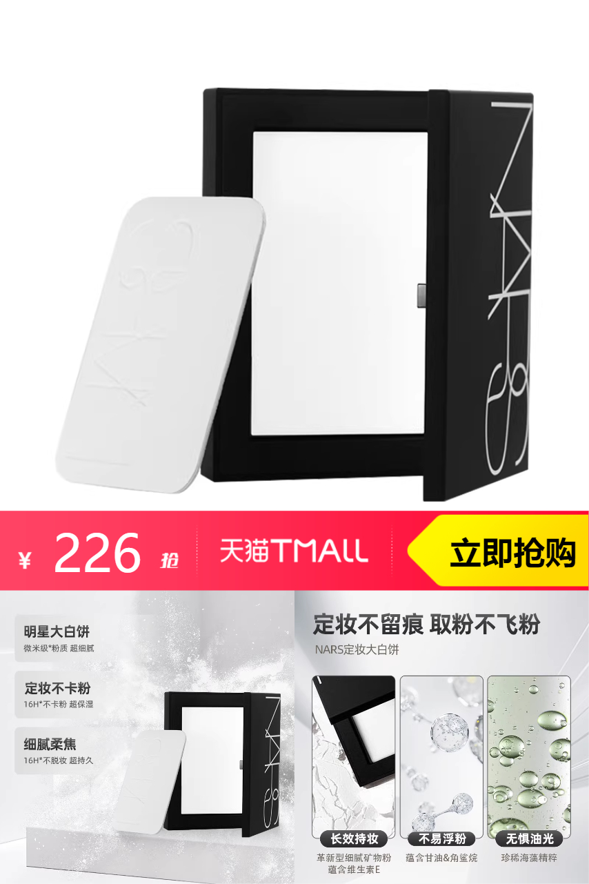 【立减140,商品券3,88VIP11.3,淘金币3.69,9折直播券21.47,消费券23.53,品牌立减20,到手价146.01】Nars娜斯定妆大白饼10g,细腻柔焦,硬核定妆。