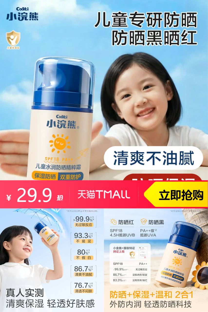 【淘金币抵扣6.4,88vip消费券凑单,到手21左右】小浣熊防晒霜,按压设计超方便!补水保湿+舒缓晒后泛红,一抹爆水珠,效果堪比多瓶!淘金币可叠加,儿童护肤选择