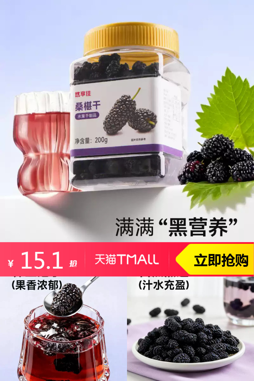 【立减2.8元,店铺优惠券5元,到手价15元!】饱满无沙,头茬采摘。满满“黑营养”甄选大果,配料表只有桑椹干。多重筛选,低温烘制,密封罐装。无香精,不染色,不熏硫 !