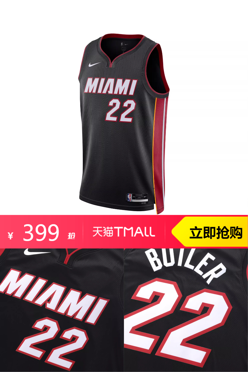 【原价490-立减91-淘金币18.26-疯四礼金79.8-消费券分摊47.22=253.72元】NBA热火队吉米巴特勒男子SW速干球衣,轻薄不闷汗。