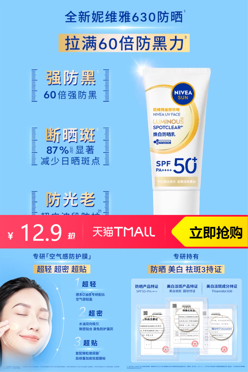 【淘金币到手12.52】妮维雅UVSPF50高倍面部防晒10ml,双层抗晒网,60倍防黑力。