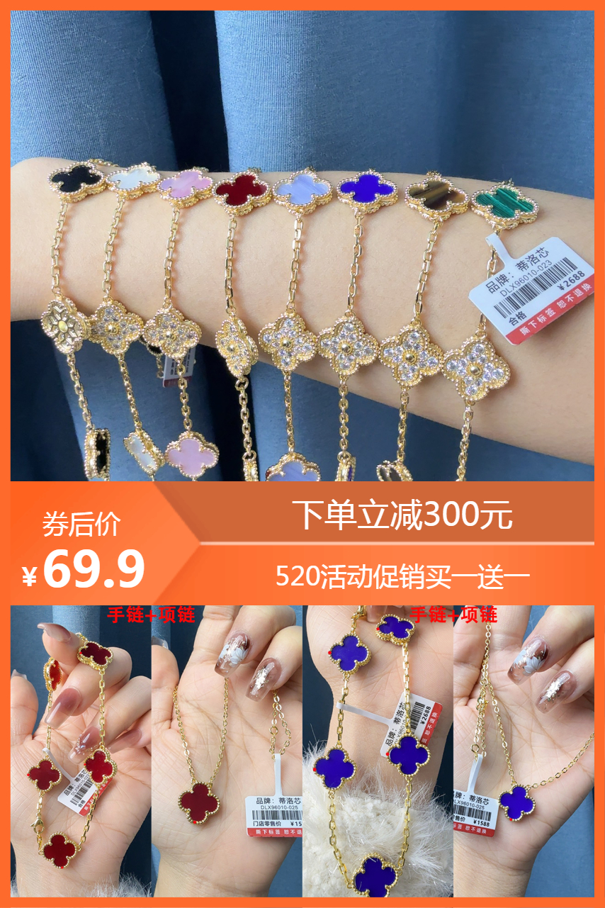【买一送一】520活动来啦!经典五花四叶草手链项链活动来啦!男生女生都能带买回去送爱人、送亲戚、送姐妹、送闺蜜,实物+证书+礼盒+手提袋都有!防过敏,不掉色!!网红爆款,一年四季都可戴!每款都敲美的!都超有质感,而且还不掉色!喜欢吸睛的宝子,强烈推荐!戴真的超高级的!很仙!