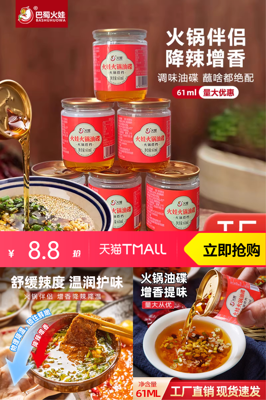 【淘金币可抵0.36,到手8.44】巴蜀火娃正宗火锅油碟香油61ml*5,火锅油碟,增香提味。