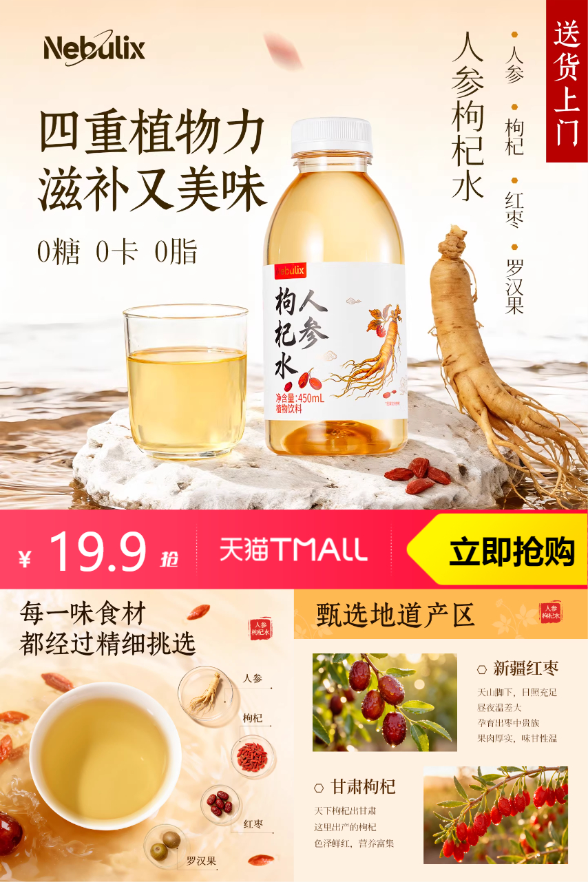 【官方赠送淘金币,有责到手更低】星珀人参红枣枸杞水450ml*8瓶,四重植物力,滋补又美味。