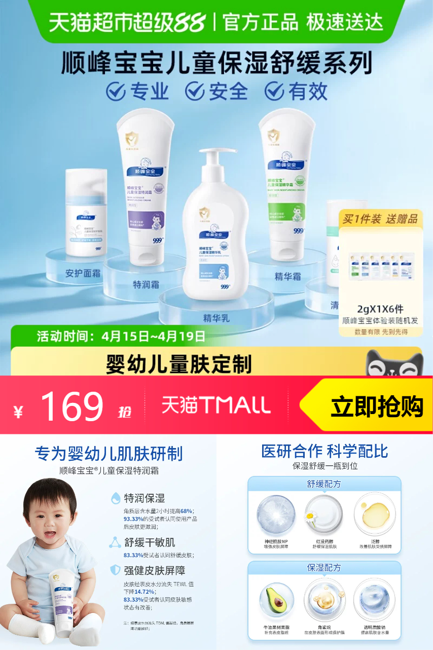 【赠品共计:32g(顺峰宝宝保湿霜2g*6袋+顺峰宝宝保湿霜20g*1支) 原价298-券优惠79-店铺优惠50=到手价169元】顺峰宝宝儿童保湿特润霜225g赠品32g,专为婴幼儿肌肤研制。