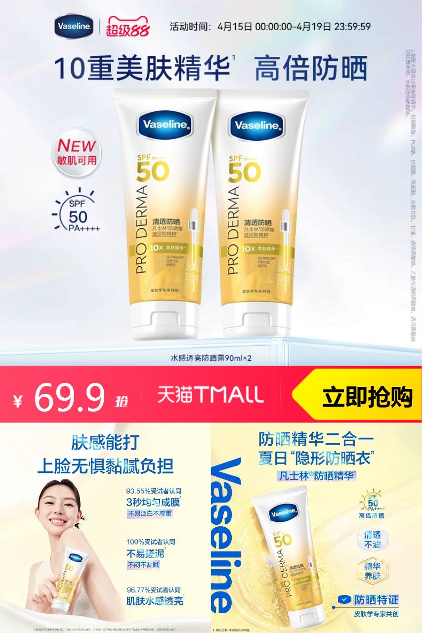 【原价86.1元-官方立减11.2元-5元券=69.9元,淘金币1.72元,可叠加消费券,到手59.7元】暴晒无惧,养肤不止!凡士林水感透亮防晒霜,SPF50+高倍防护,一抹化水秒成膜,清爽不粘腻,肌肤透亮水润一整天。