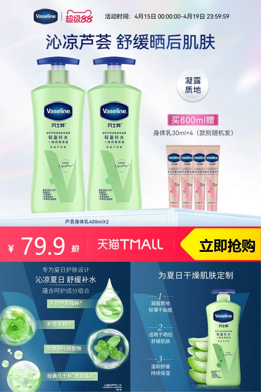 【原价97.6元-官方立减12.7元-5元券=79.9元,淘金币2.92元,可叠加消费券,到手67.2元起】凡士林芦荟舒缓身体乳,滋润保湿清爽不粘腻,晒后修复首.选!大容量装,性价比高,肌肤水润有光泽!