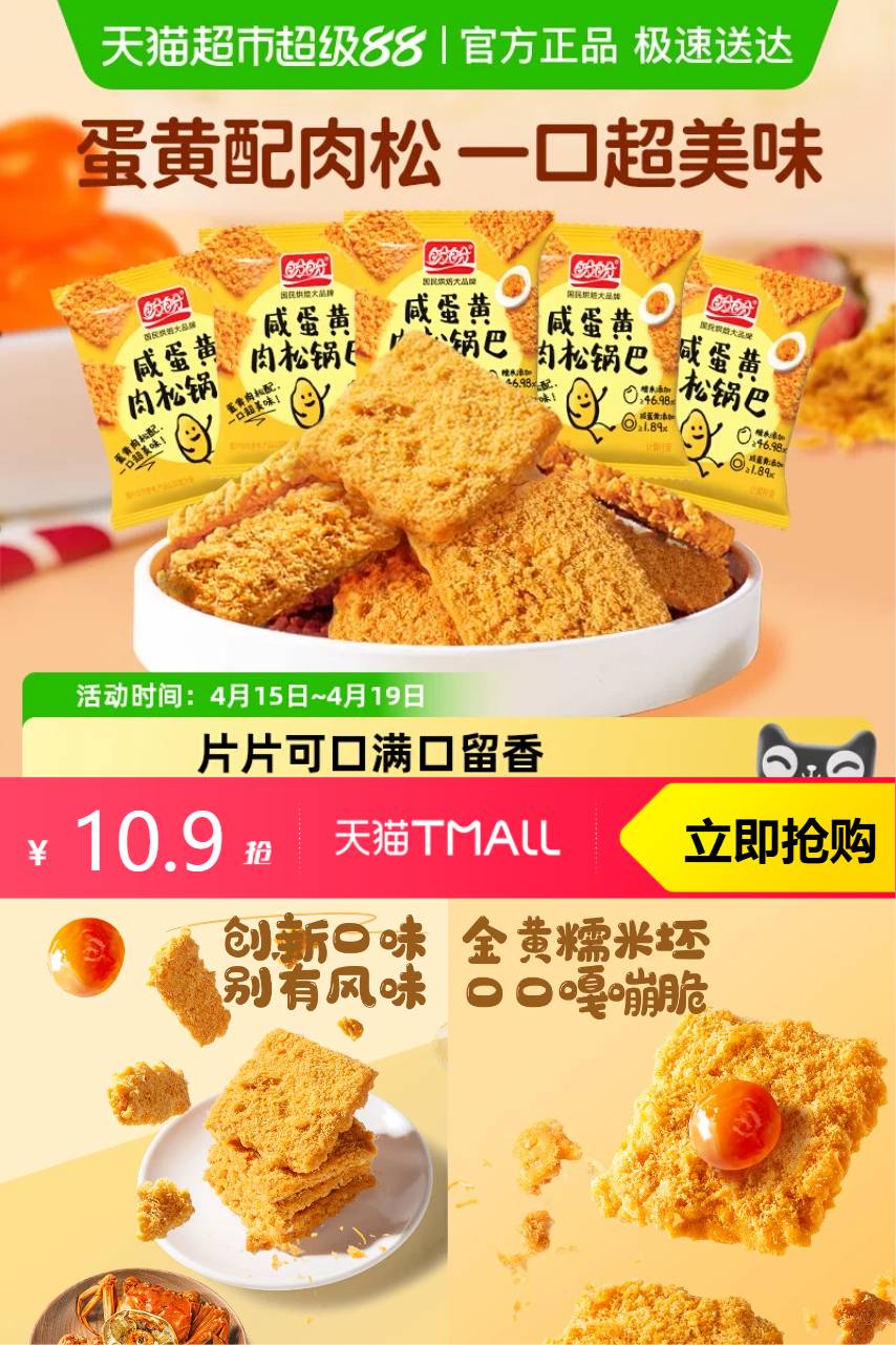 【原价19.9-立减6-淘客券3-88vip0.55-金币0.98=9.37,叠消费券200-25,到手8.22】咬下去是那种酥酥脆脆的带点扎实感,完全不咯牙也不会碎得掉渣到处都是咸香刚好,咸蛋黄的沙香混着肉松的鲜,一点点都不腻,越嚼越香根本停不下来!
