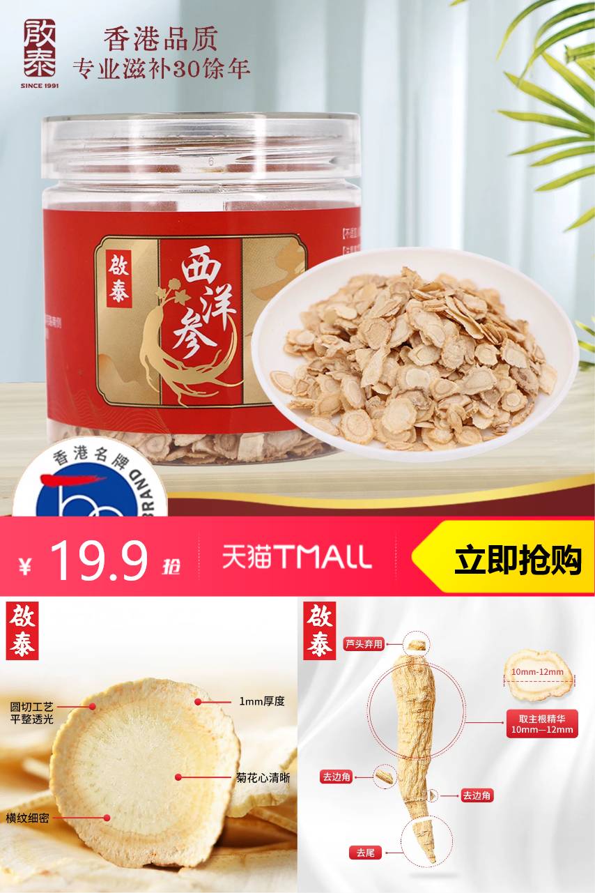 【原价29.9-满29减10-淘金币加抵0.59=到手价19.31】香港启泰西洋参切片,精选吉林长白山原产,圆切花旗参片,保留原色原香。微苦回甘,参香浓郁口感醇正。品质保证!