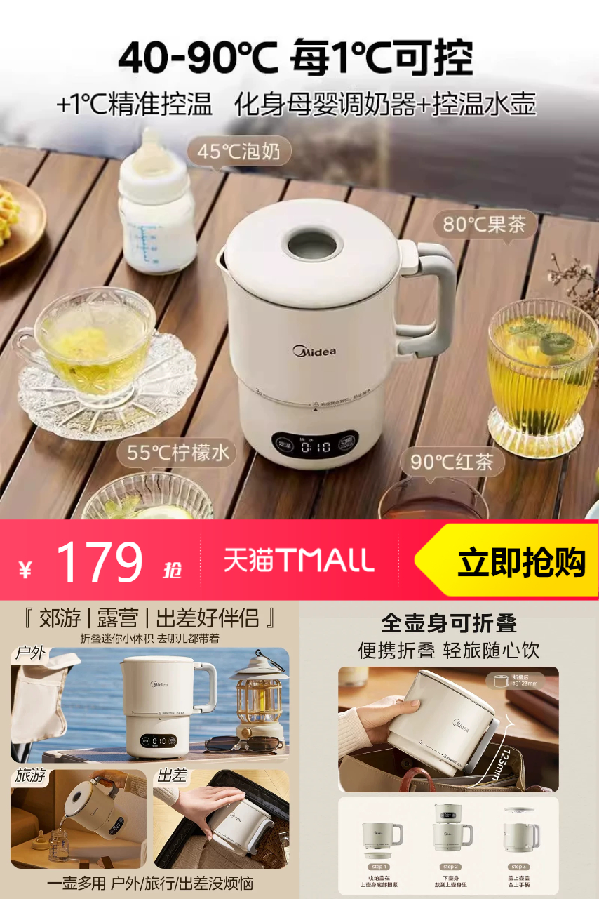 美的 美的折叠电热水壶烧水壶恒温多功能316L 599元减420 商品纠错