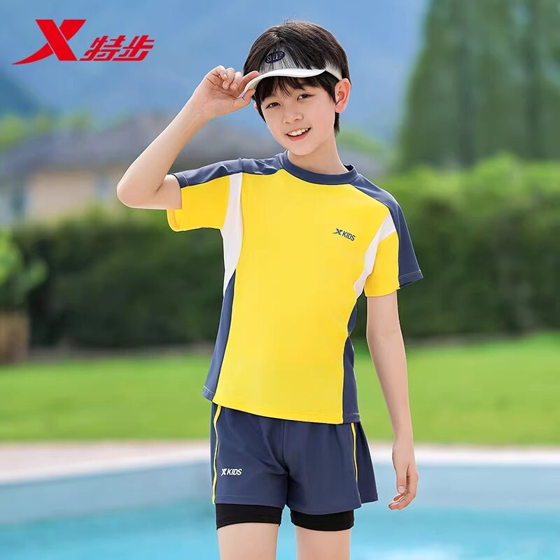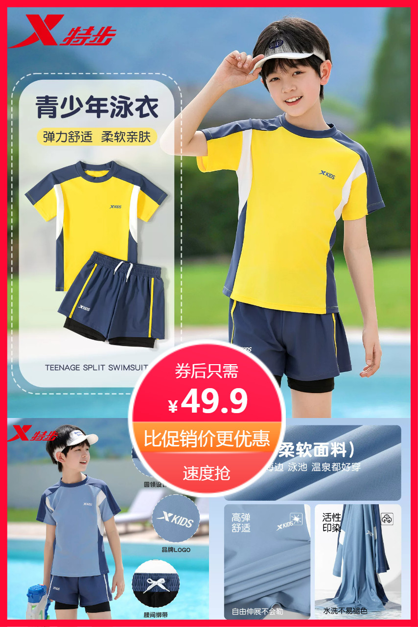 【红包+凑单约43】特步儿童泳衣套装全新上市!双层加厚防晒面料,速干透气不紧绷,专为活泼男孩设计~分体套装!含泳衣+泳裤,高弹腰头不滑落,游泳课/夏令营轻松应对!