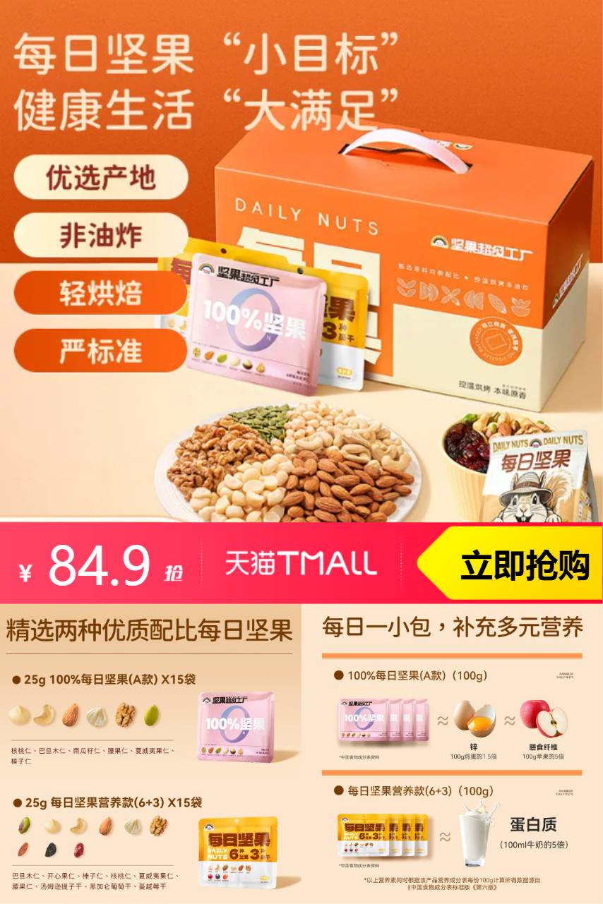 【原价114.9,官方立减30,到手84.9,下单送一大袋250g每日坚果10小包】【天虹牌每日坚果整箱】750g科学配比 每日1包轻享健康营养,精选8种混合果仁果干 无额外添加糖盐 ,独立小锁鲜包装 随身带随时补能,早餐、追剧、办公补给都适配,每箱够吃30天,承包你的月度健康补给