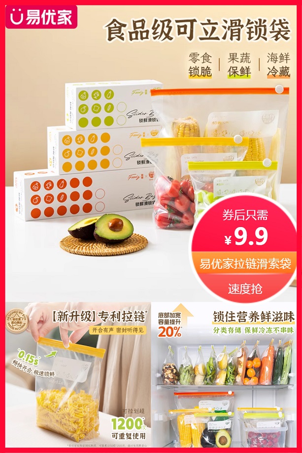 官方立减2元后约9.9元,买2件送PE手套150只,买3件送手套+保鲜膜】封袋拉链式,可站立,7种尺寸,多种用途,可重复使用,随心收纳,0.15毫米,畅快开合,食品级检测,不含BPA,塑化剂。