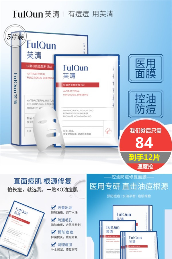 【叠加9折消费券淘金币下单只要72.7元拍第.一选项,速度抢!!】芙清医用控油祛痘面膜,控油清痘,调理油脂,闭口粉刺,敏感修复,补水保湿,给您一款专业的祛痘修复面膜,械字号医用无菌生产,三甲临床认证!