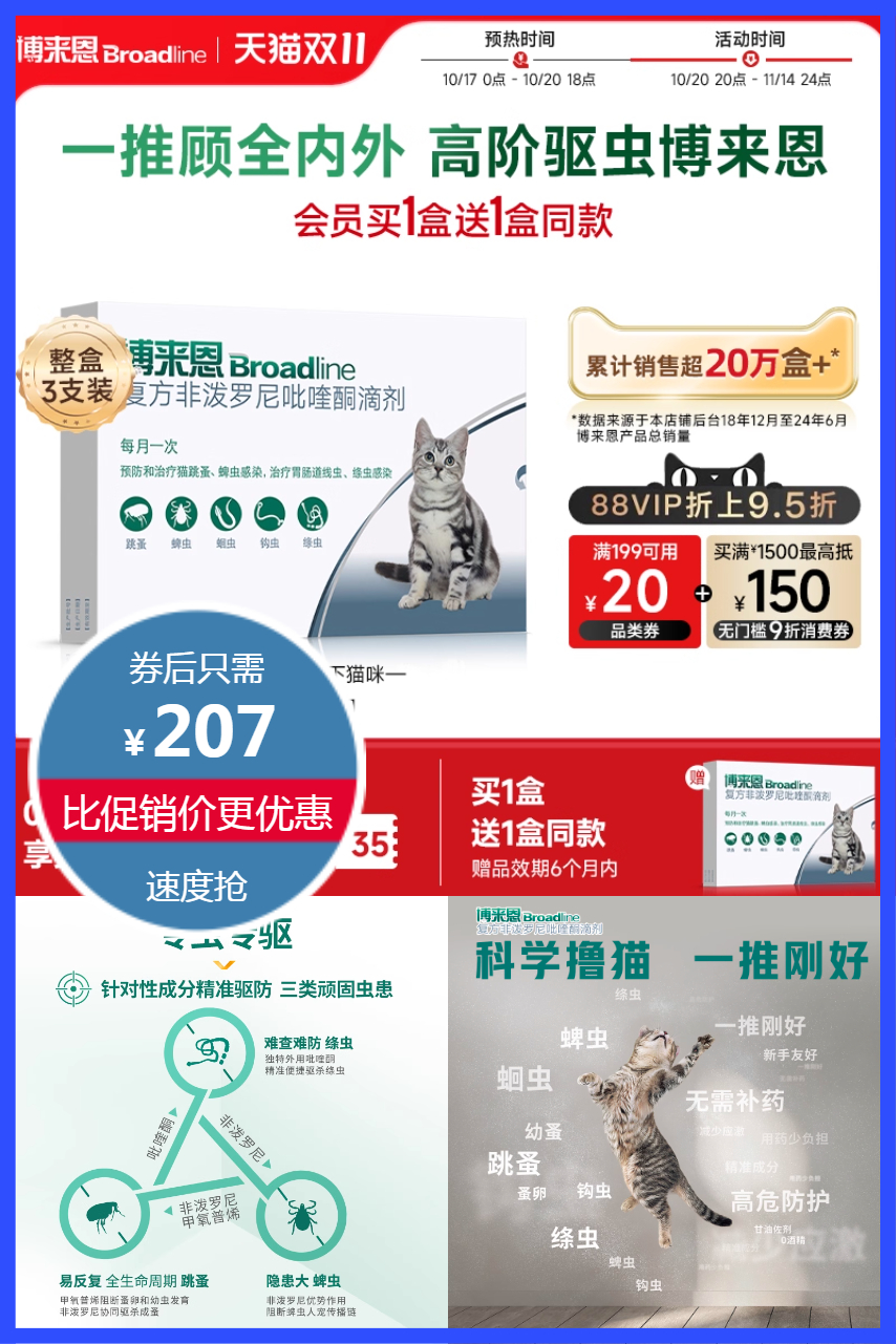 首单15元,立减51元88会员叠加劵到手240.55元!博来恩猫咪专用3支,适用于2.5kg以下猫咪,创新滴管设计告别塞药烦恼,有效驱除跳蚤、跳蚤蛋、耳螨、虱子、蛔虫钩虫等,内外驱虫一支搞定,每月一次呵护全家!