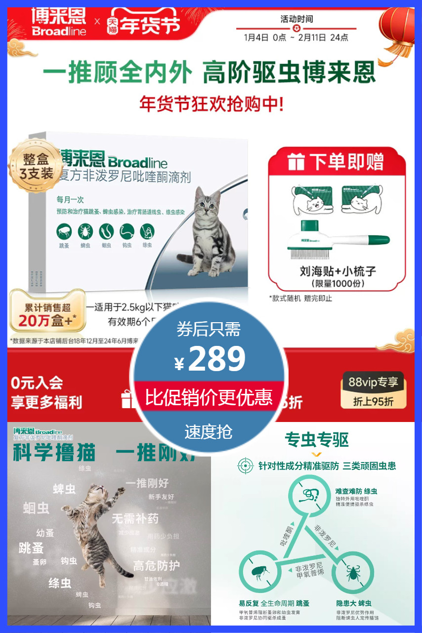 立减51元,88会员消费劵25元叠加劵到手249.55元!送刘海贴+小梳子限量1000份!博来恩猫咪专用3支,适用于2.5kg以下猫咪,创新滴管设计告别塞药烦恼,有效驱除跳蚤、跳蚤蛋、耳螨、虱子、蛔虫钩虫等,内外驱虫一支搞定,每月一次呵护全家!