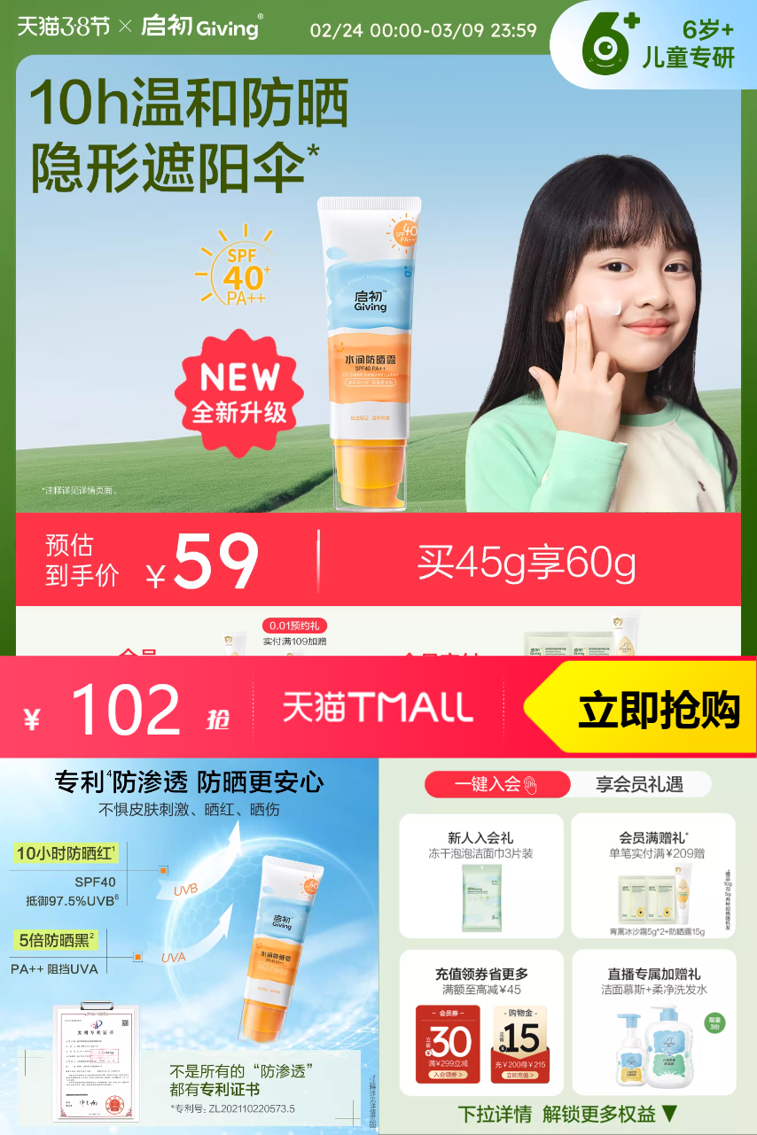 【赠水润防晒霜15g*2支,到手120g;下单立减20元,入会领会员券10元,淘金币抵扣13.6元,88vip抵扣5.11元,首单礼金抵扣4元,消费券抵扣10.4元,到手68.99元,】启初SPF40儿童防晒霜40g*2瓶,品质优选。