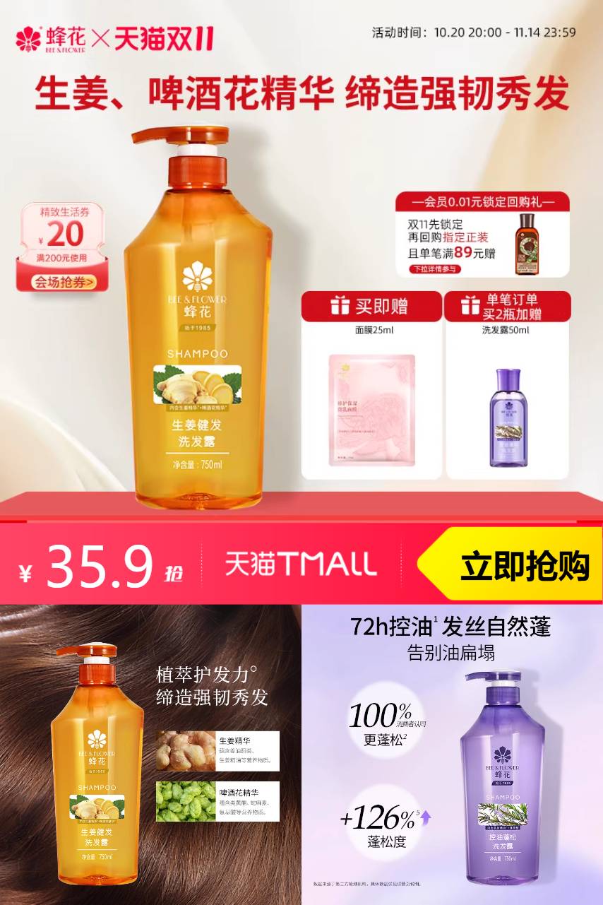 【买即赠控油蓬松洗发露50ml(限量1999份);买即赠舒缓保湿微乳面膜25ml;单笔订单买2瓶加赠控油蓬松洗发露50ml】【买即赠控油蓬松洗发露50ml(限量1999份);单笔订单(任意1款套餐) 买2份赠防脱洗发露50ml】蜂花丰盈强韧生姜洗发水,丰盈蓬松强韧亮泽,蕴含姜油酮类、生姜精油等营养物质,秀发状态在线打造蓬松丰盈感~~