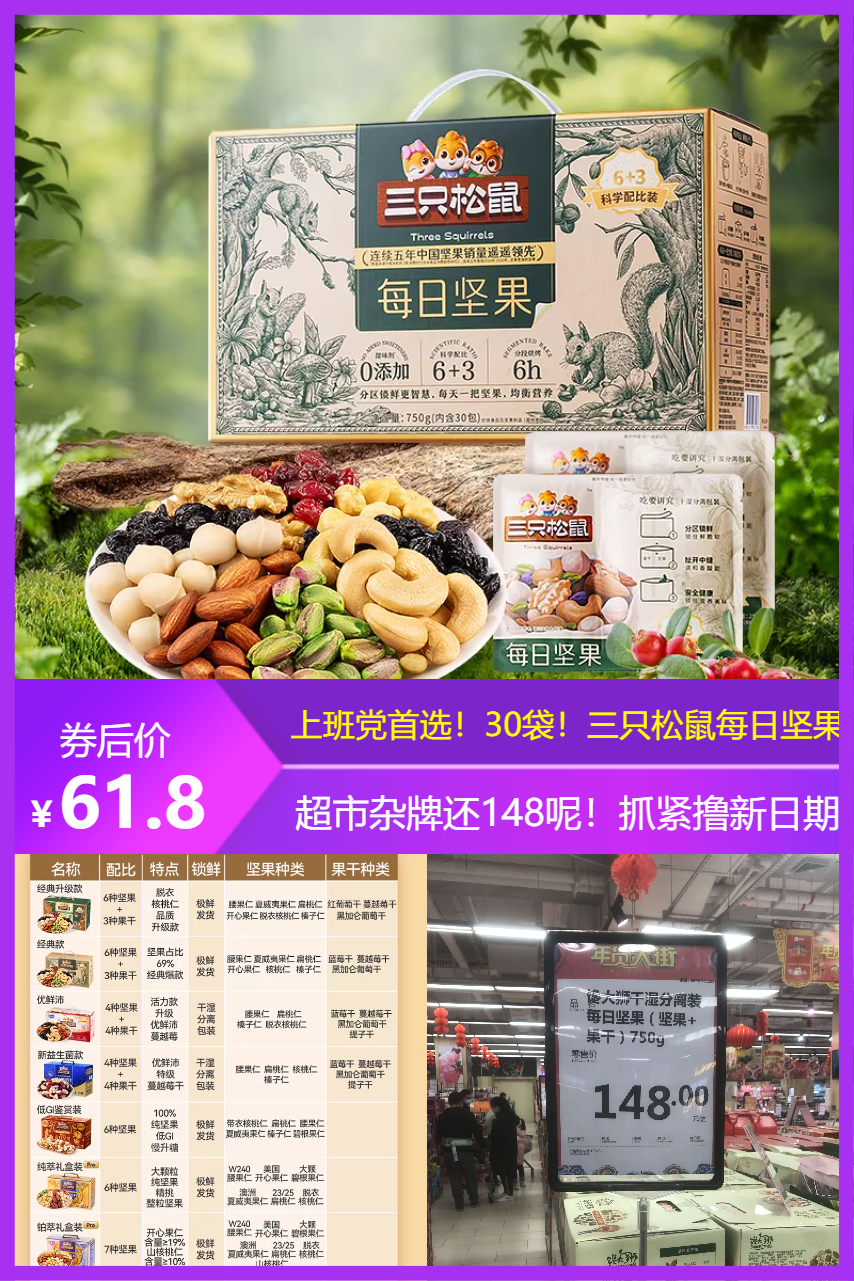 【下拉详情页百亿到手61.8三十包啊!超市杂牌都148块钱啊!】三只松鼠的每日坚果!遇见就是拼手速的时刻!坚果中的王中王!多种营养一次补充,满满一大箱!每天吃一袋,让你元气满满~还可以拿来泡个酸奶!绝了~