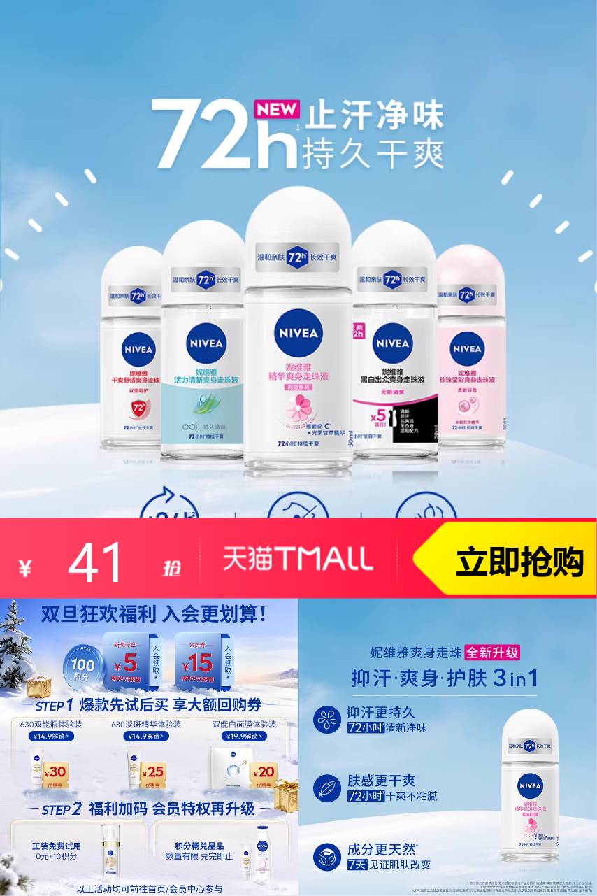 【淘金币叠加39.23,消费券和惊喜券到手31.51】妮维雅腋下滚珠女男士抑汗,一抹干爽,轻松应对,清爽升级,毛孔轻呼吸,持续干爽净味,有效保持肌肤干爽,质地轻盈,有效焕亮,改善腋下肌肤黯淡,有效弹润肌肤,肤色更显光泽