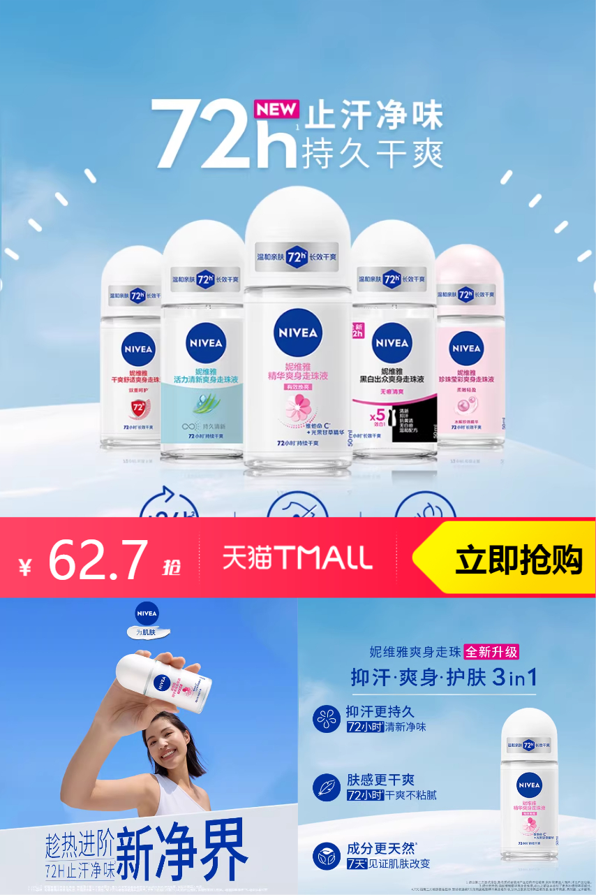 【淘礼金2.7+淘金币4.57+凑单消费券到手48.58】妮维雅腋下滚珠女男士抑汗,一抹干爽,轻松应对,清爽升级,毛孔轻呼吸,持续干爽净味,有效保持肌肤干爽,质地轻盈,有效焕亮,改善腋下肌肤黯淡,有效弹润肌肤,肤色更显光泽!