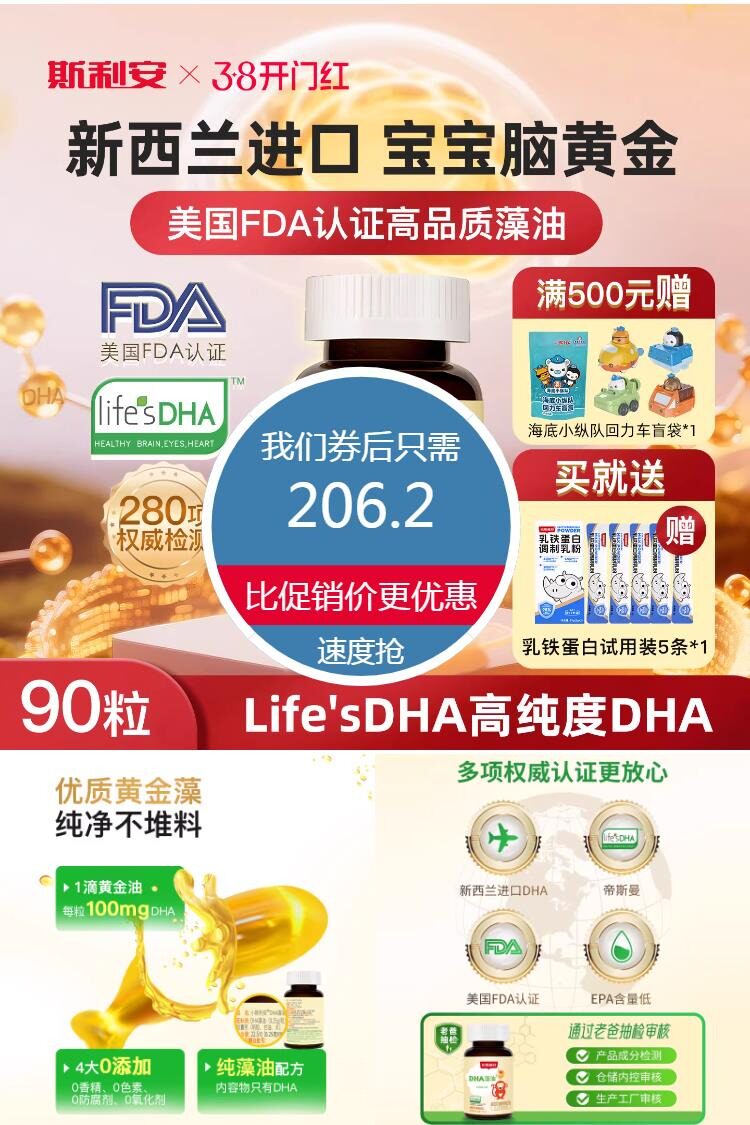 【凑单+88VIP+淘金币!送乳铁蛋白*5】藻油90粒,美国FDA认证!优质海藻油提取,含量高更纯净,易吸收!促进大脑发育,让孩子更聪明,无人工色素香精添加,适合孕妇和孩子的藻油!