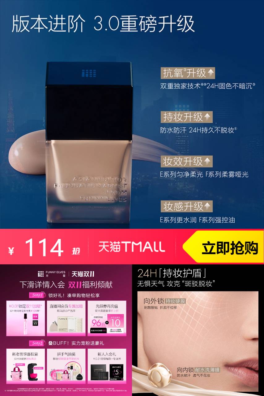 【淘金币可抵扣4,无门槛9折消费券后99,买即赠同款持妆粉底液7ml*2+体验装0.5g*3+三角海绵*1】叠加7.6元淘金币,叠加200-20品类券以及消费券到手95.69~买即送同款持妆粉底液7m1*1+持妆粉底液体验装0.5g*3~没想到funnyelves粉底液巨润!!