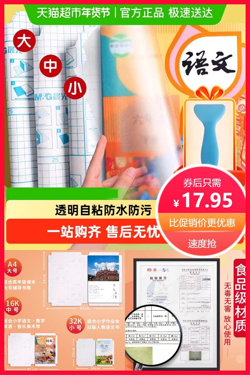 【晨光大中小全套30张磨砂书皮+课程表+57枚晨光姓名贴+平推器】免裁自粘,防滑磨砂包书皮,多种规格,安全环保,尺寸齐全,小孩子也能动手包好,环保水性胶水,粘性适中,不伤书本~