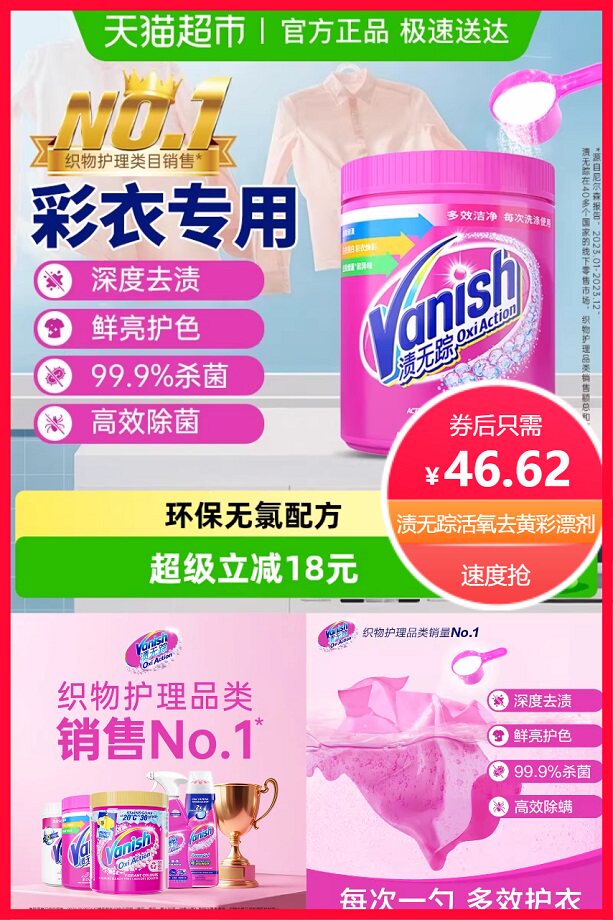 【猫超包邮次日达,立减18元+券10元+点击右上角三个点进入淘金币抵扣15.28元+88vip省3.1元后约43.52元】明星妈咪推荐,Vanish焕彩去渍粉!高效活氧不含氯,洁净同时不伤衣物纤维~还有增艳去黄的效果!不管是火锅渍还是油渍,通通轻松搞定!