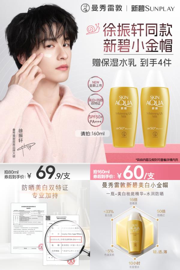 曼秀雷敦金帽防嗮霜160g2瓶装,夏日出行必备防晒!拍:160g【配方升级】水感高倍防晒配方升级2瓶装淘金币卷后到手82元单只只要41元,部分账号限时红包到手低至77元2瓶!下单加赠:化妆水30ml*1+水乳30ml*1到手4件,清爽不油腻,美白修护二合一。适合面部身体使用,夏日防晒!