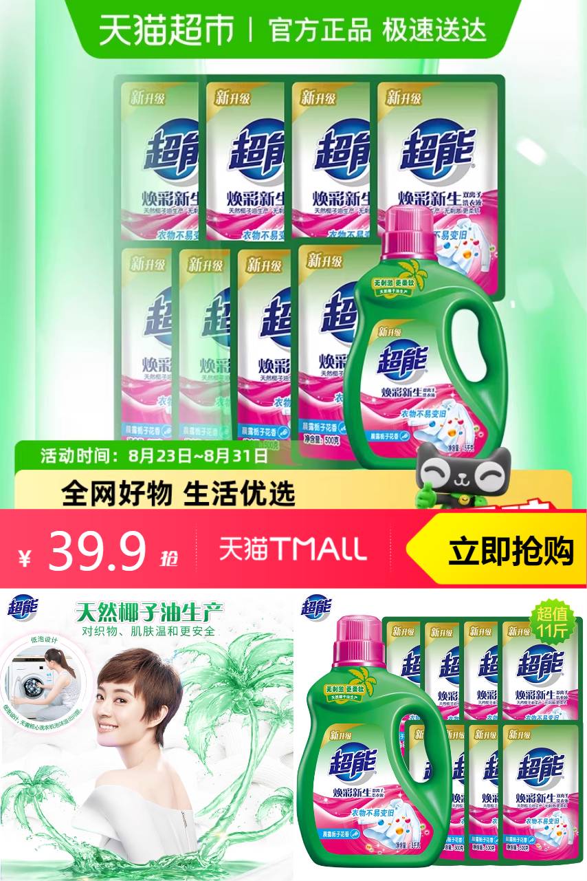 猫超×超能洗衣液神价!!1瓶8袋(共11斤)才39.9!!是双离子洗衣液!让衣物护色增亮~低泡沫易漂洗,比平常洗衣液好用的多,有好价就囤!