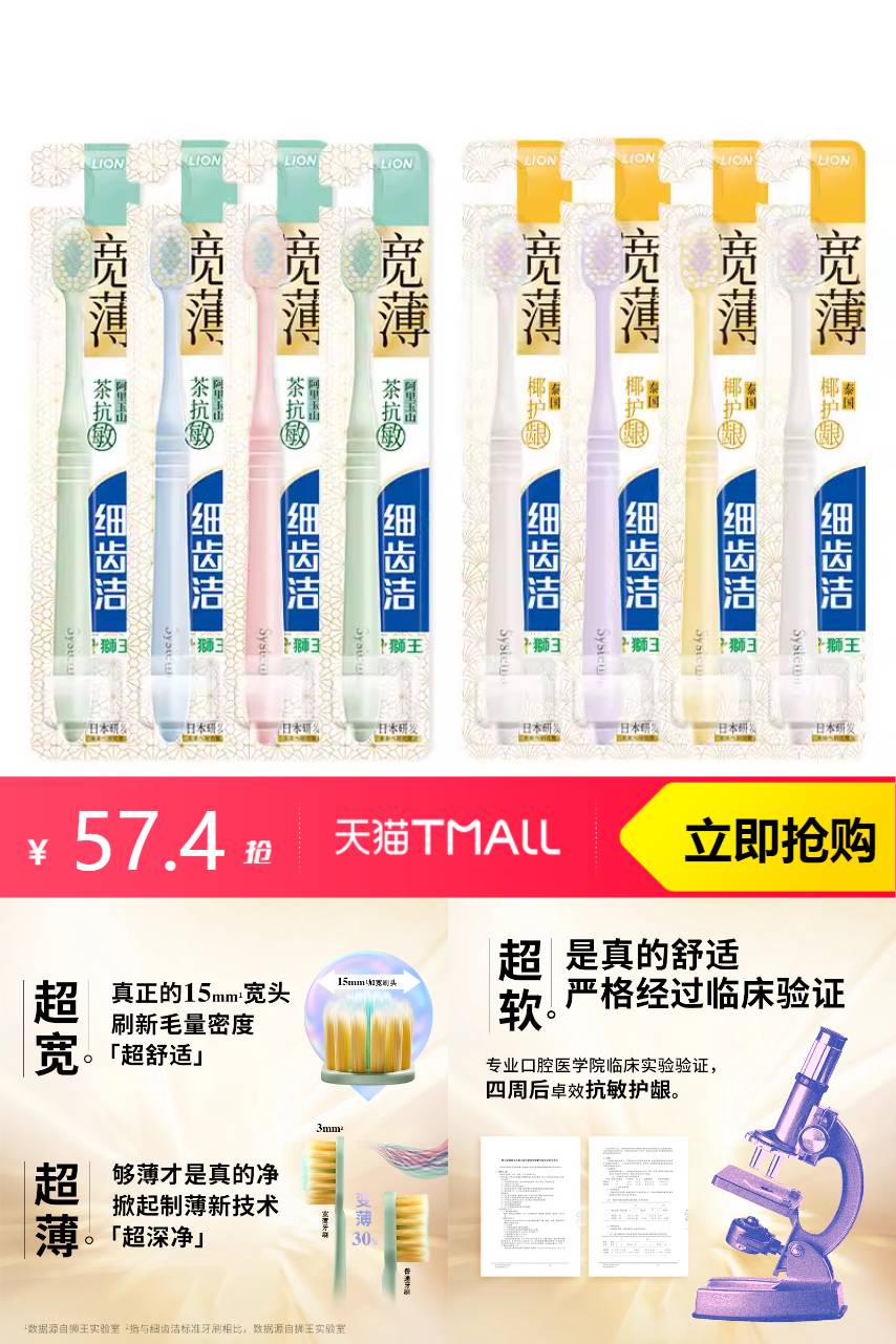 【官方立减15%(抵扣18元)无门槛9折消费券抵扣5.623元,精致生活券200-20元,抵扣11.74元;淘金币抵扣7.02元,到手33】LION狮王细齿洁宽薄宽头软毛牙刷4支,成人软毛,家庭装,情侣专用,减压更抗敏,给你从未体验过的口腔洁净体验,一次两排牙、一刷就到底!!