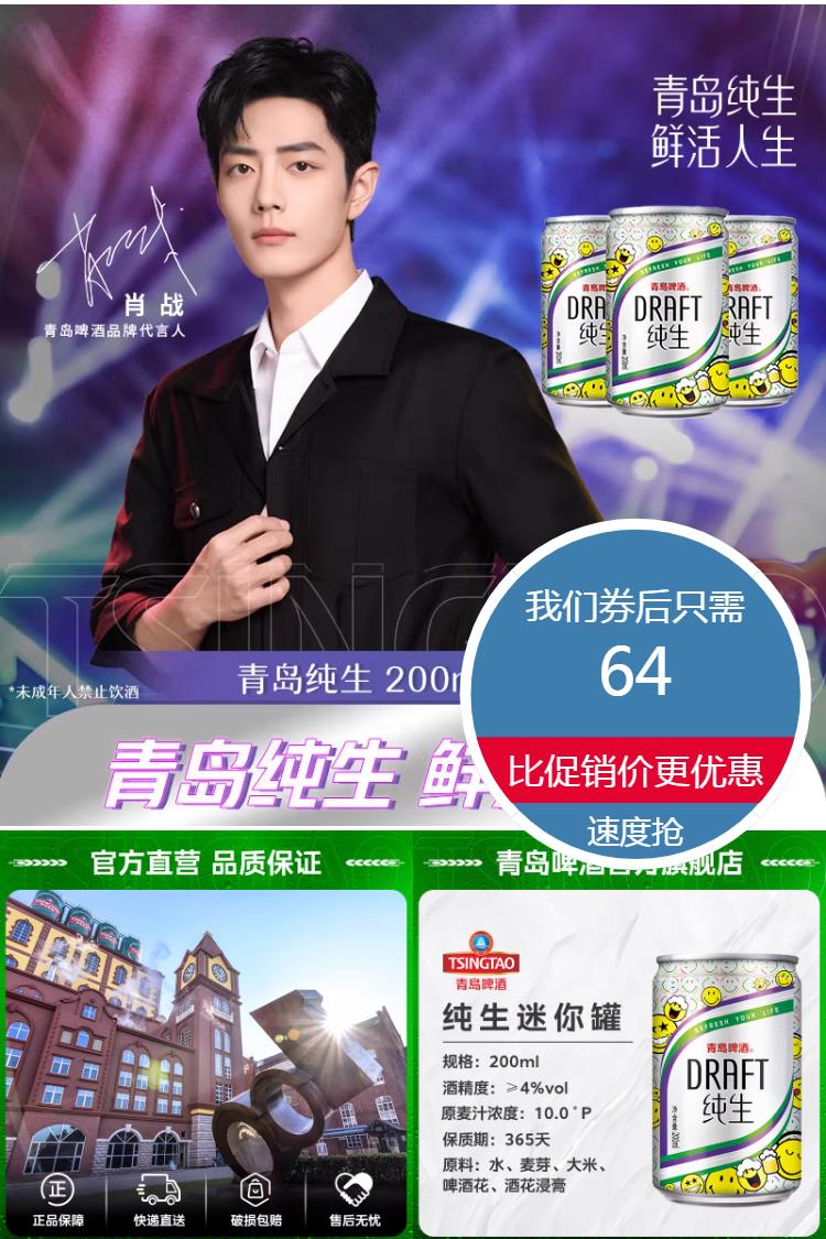 【88会员到手60】夏日标配来了!青岛纯生啤酒,精选优质大麦与德国酵母,4度微醺刚刚好。200ml迷你罐,方便携带不浪费,冰饮佳品配烧烤绝了,趁好价入手!